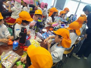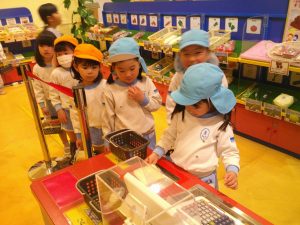 キッズマートでは、かごに、お野菜、お菓子等、好きなものを入れてバーコードで精算します🧮