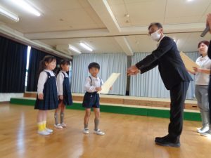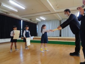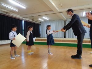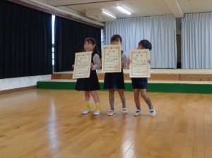 絵画の部 ”奨励賞” のお友だち3人が、園長先生から賞状を読みあげてもらい受け取りました 🏆