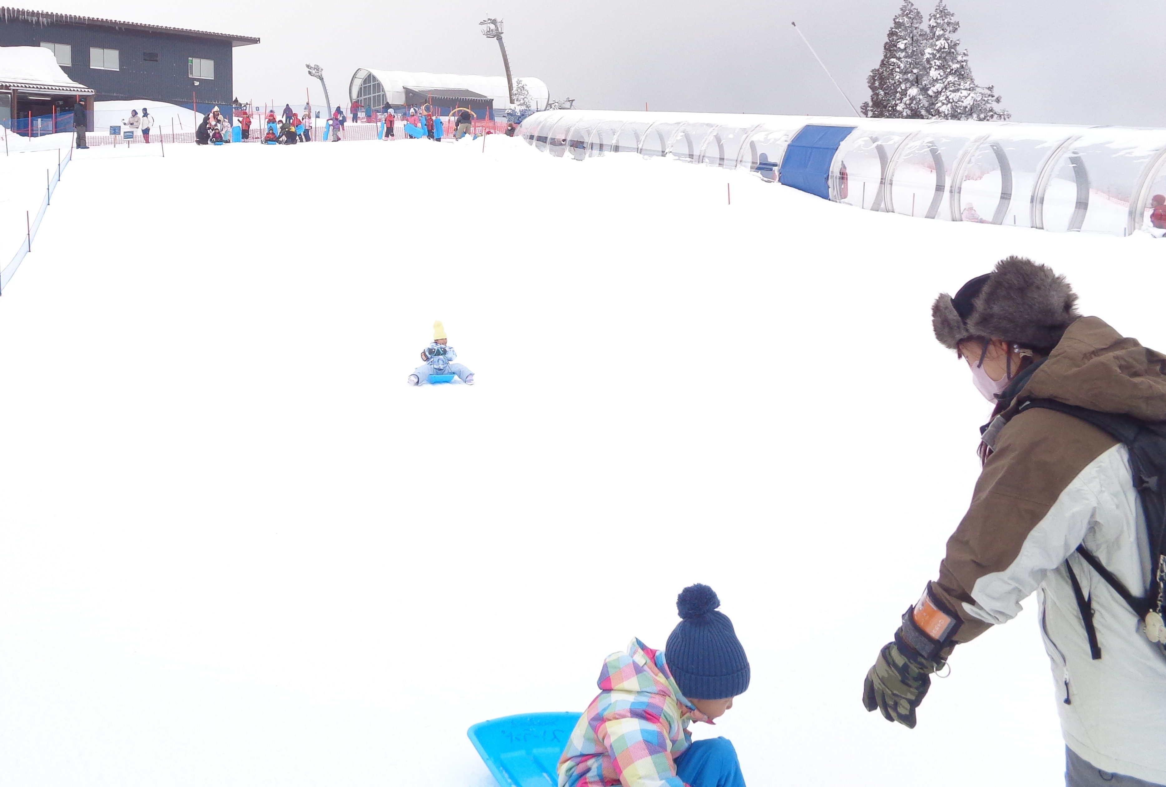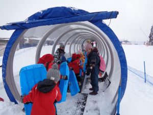 トンネルの中の動く歩道を抜けて、パウダースノーを滑ります🎿