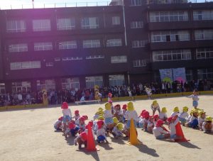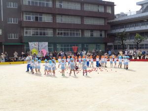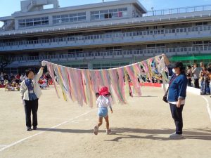 年長さんが、 赤チーム、青チーム、黄色チーム、白チーム に分かれて、バトンをつないでいきます!!