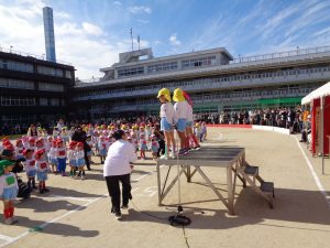 年中組さんが、きりんさんチーム🦒 と ぞうさんチーム🐘に 分かれて紅白玉入れです📍