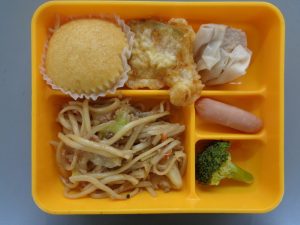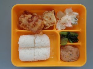 とり天(照り焼きソース) 焼きいも 一口がんも 小松菜の煮付 等