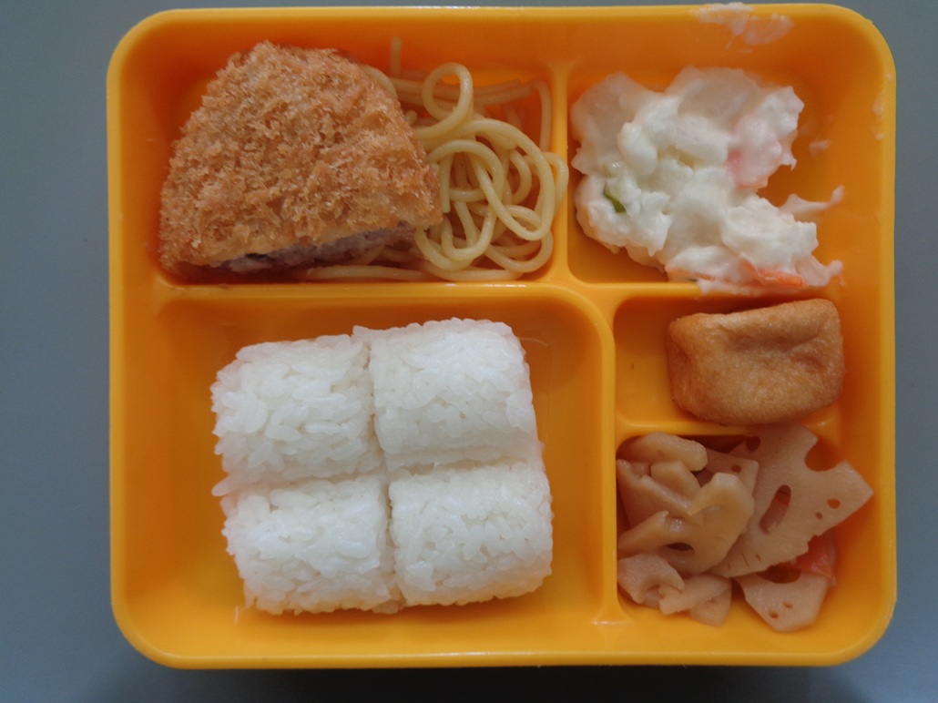 カツオカツ スパゲッティ ポテトサラダ れんこんの金平 等