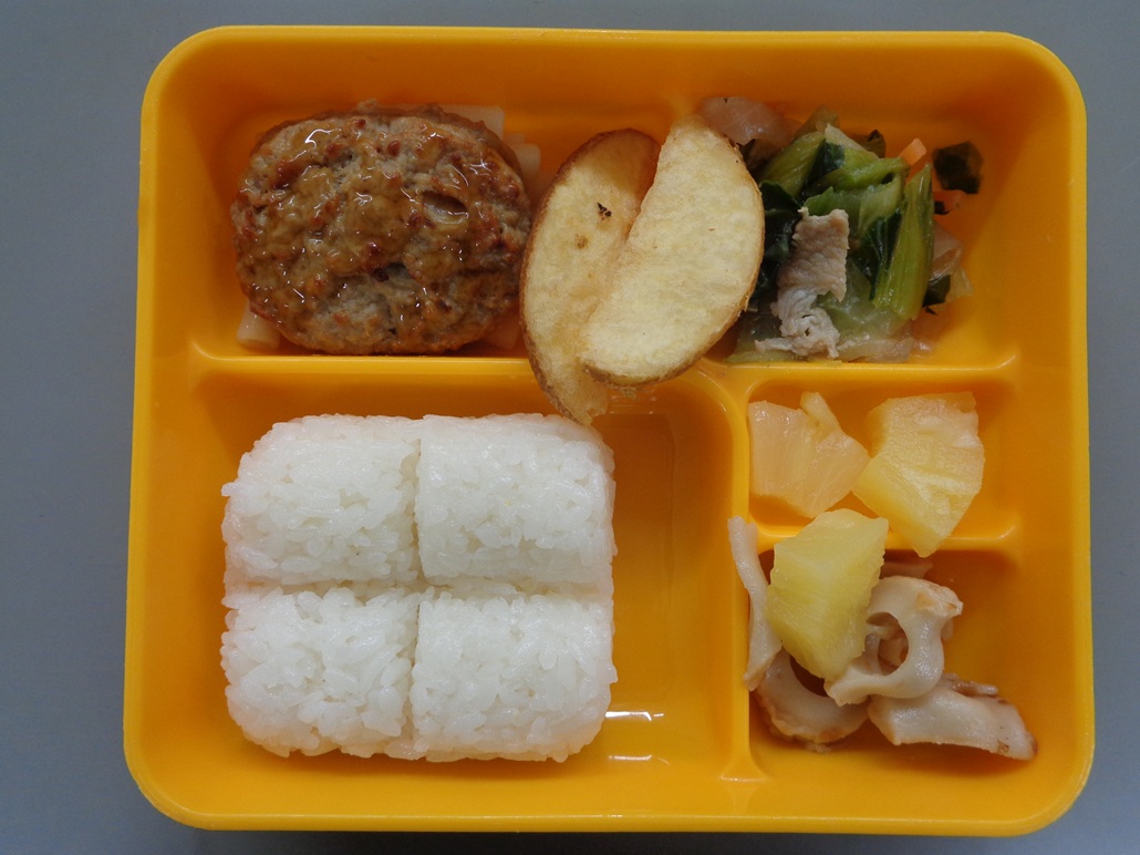 ハンバーグの照り焼き マカロニのオイル和え フレンチポテト チンゲン菜と豚肉の中華煮 等