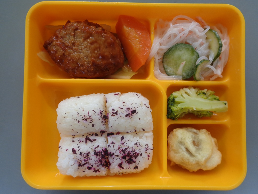 ハンバーグ 人参のグラッセ 春雨サラダ あじと豆腐ボール 等
