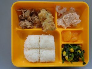 ポーク焼肉 ちくわの磯辺揚げ レンコンとツナのサラダ ほうれん草とコーンの煮付け 等