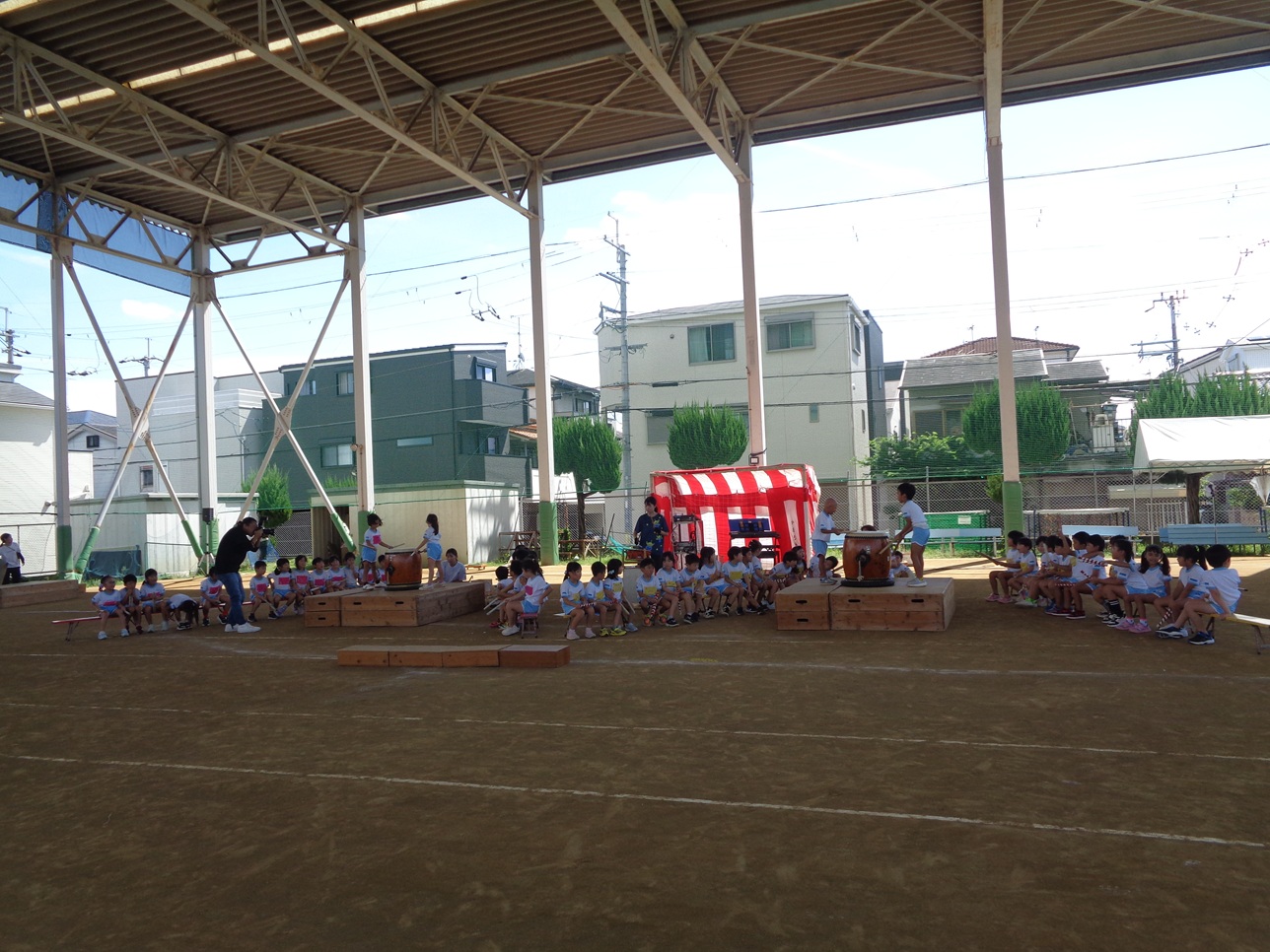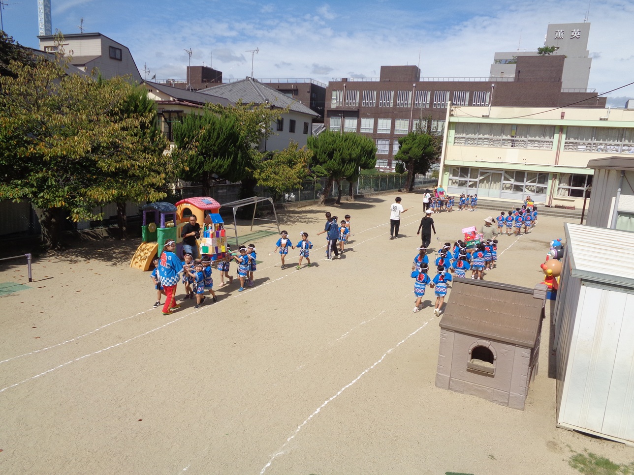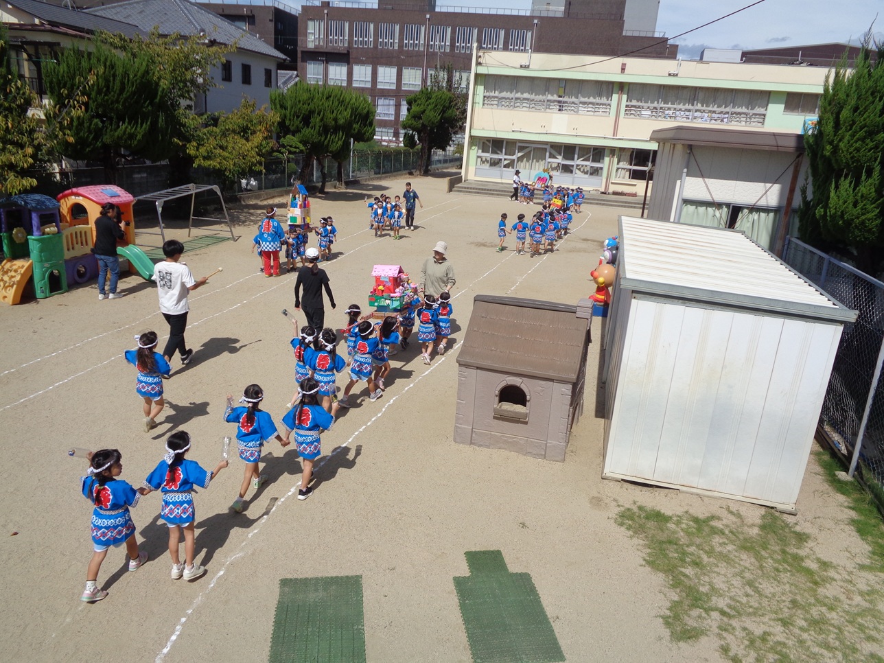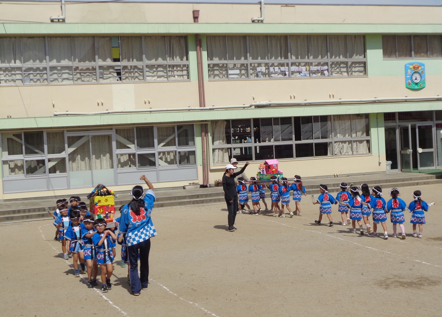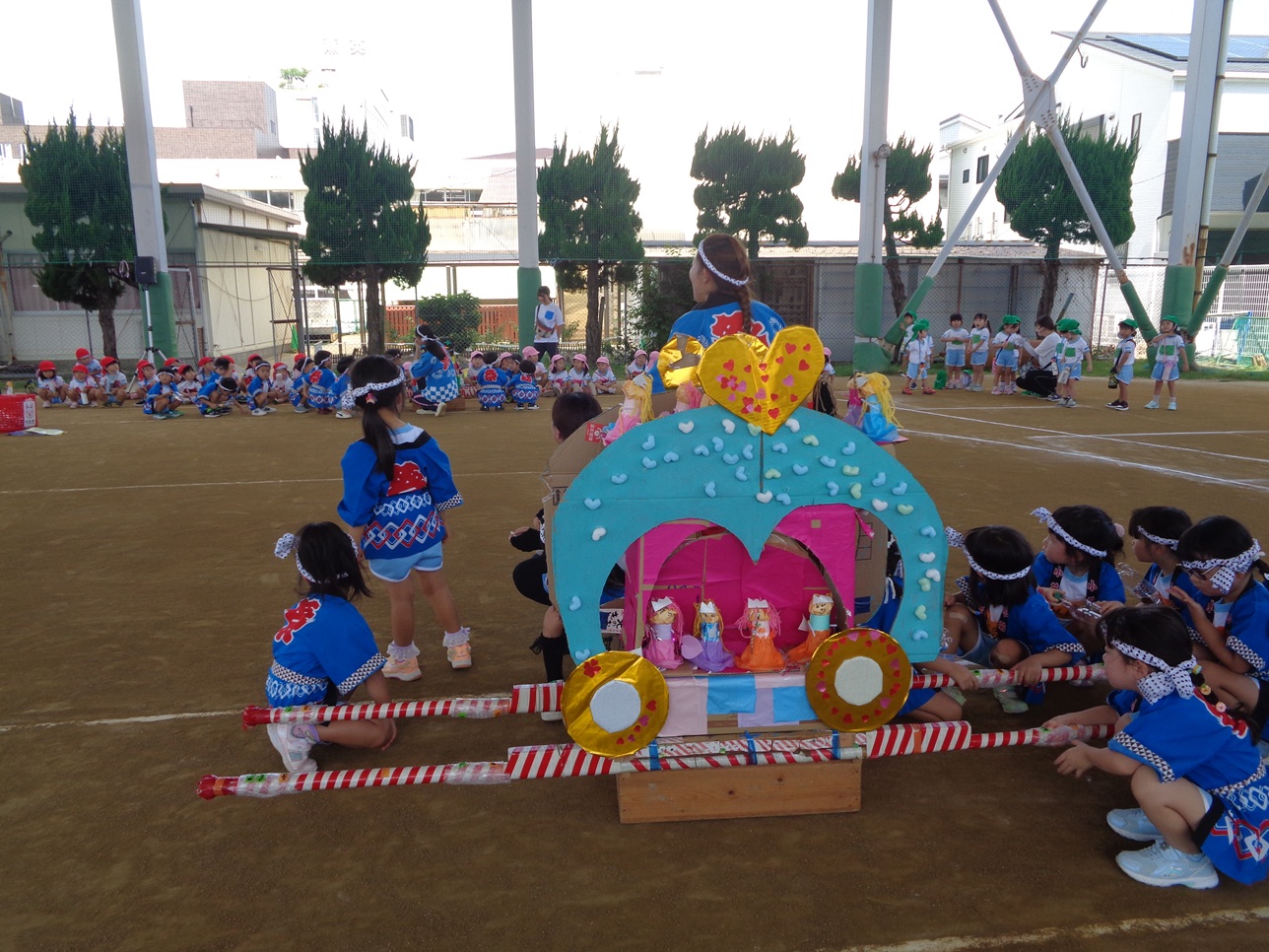 年中さんは、ハッピを羽織って、園庭をおみこしを担いで回ってみました💫